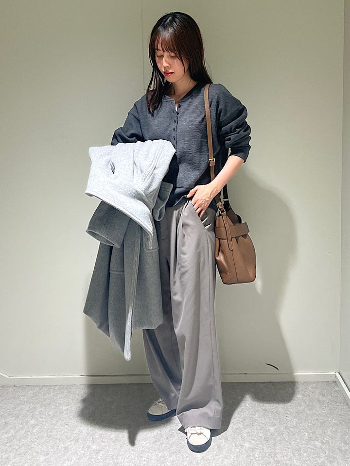 起毛感のある生地で柔らかい着心地でとても着やすいです。ややコンパクトなサイズ感でハイウエストなボトムとの合わせがおすすめです。アウターの中に着るインナーとしておすすめです。