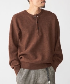 【素材感・着心地】ボイル素材のヘンリーネックニット。ふわふわと柔らかく、保温性が高い。ダボつかないシルエットでインナーでも活躍。