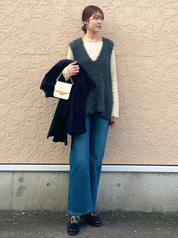 ニットは袖が長めで、ピタッとしすぎない。