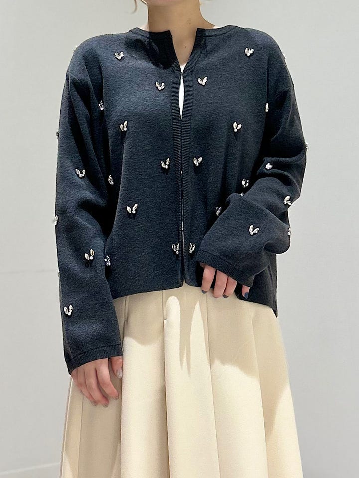 〔ONE SIZE〕SHIPS Colors:〈手洗い可能〉ビジュー ノーカラー カーディガン◇