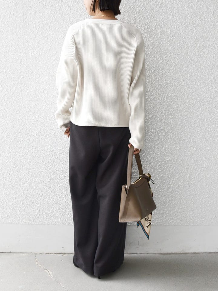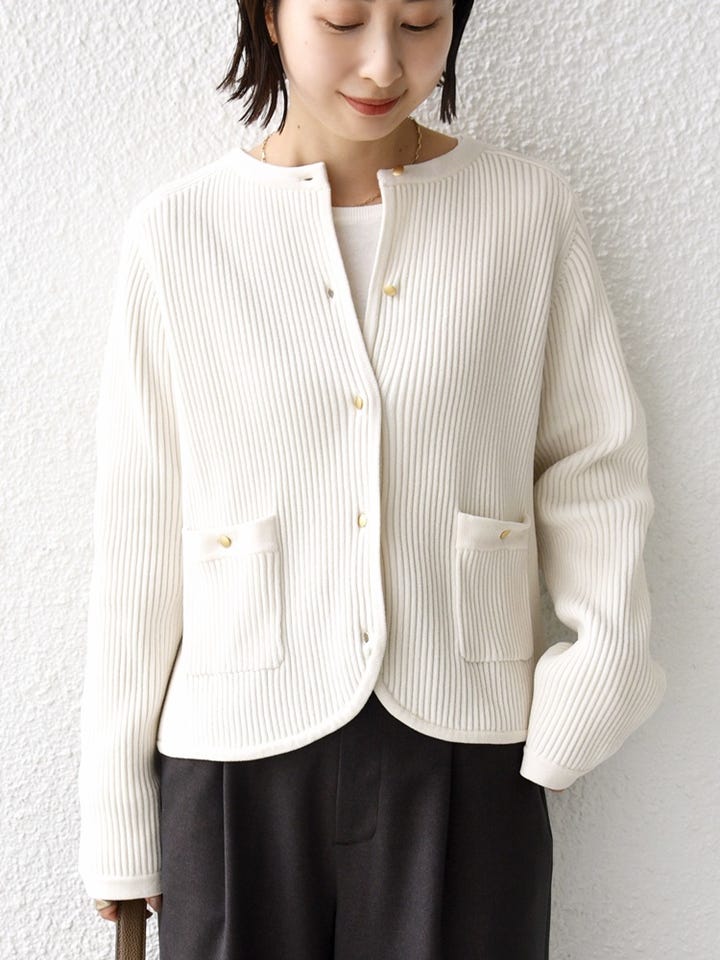 着心地:中肉でしっかりとした編み地なので、ジャケットのようなきちんと感がありながら、ニットらしい柔らかな着心地です。