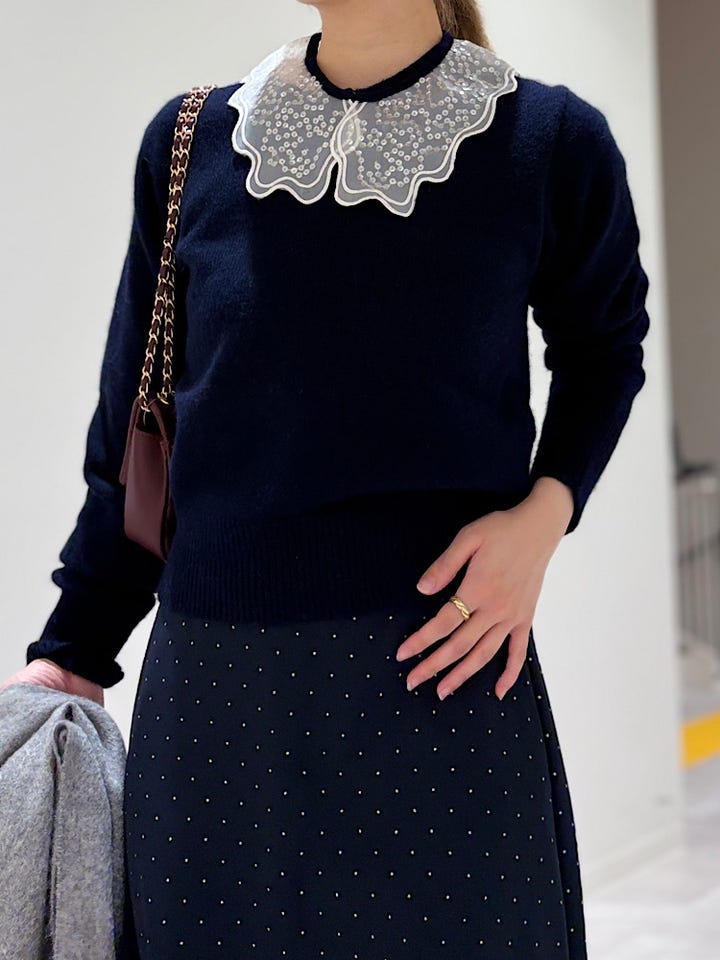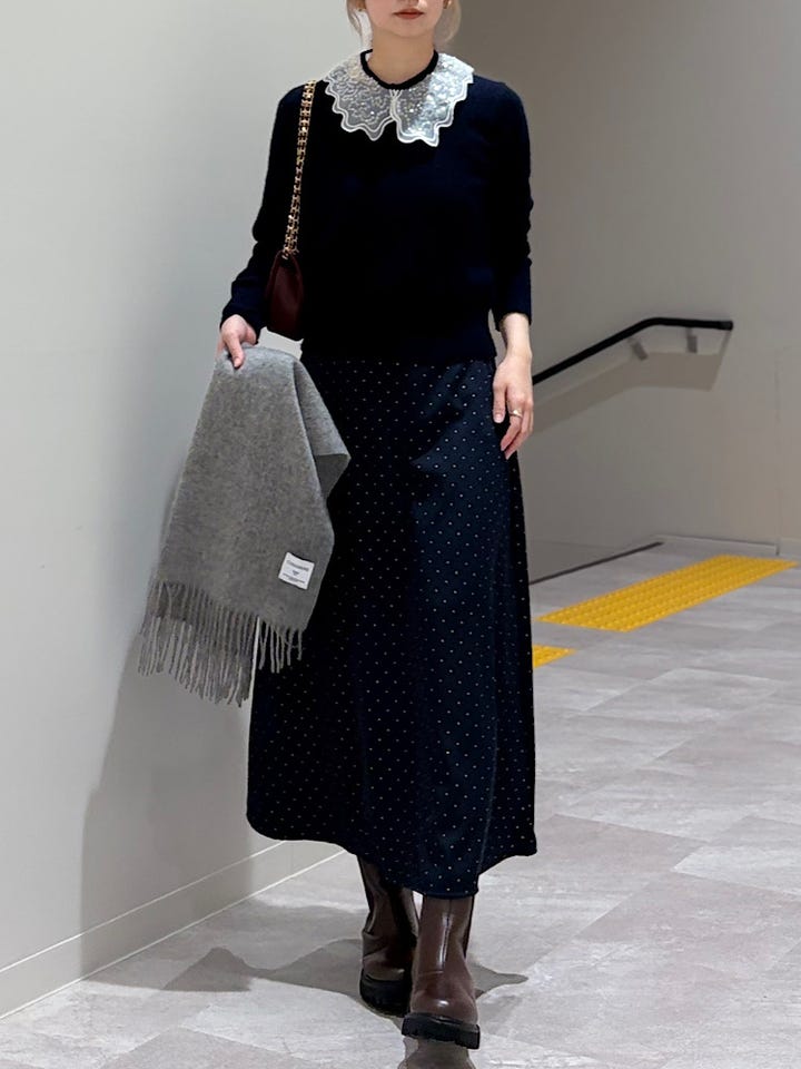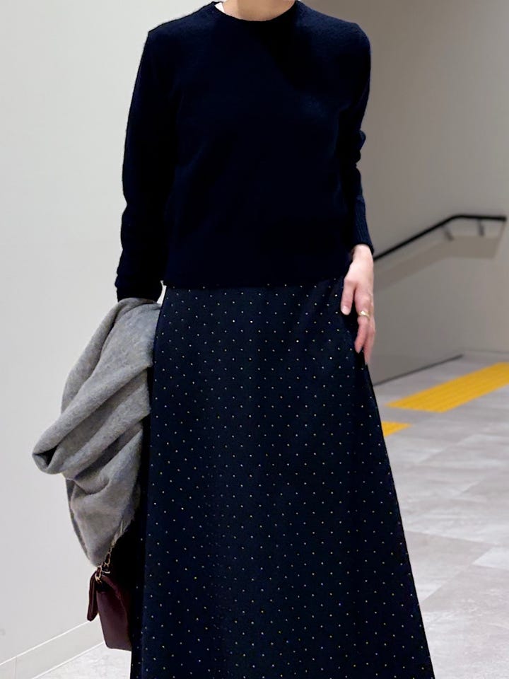 【素材感・着心地】裏地あり。きれいなシルエットで、細かいドット柄なので落ち着いた雰囲気で着用できそうです!キラッとした控えめなラメ感も今のシーズンにぴったり♪