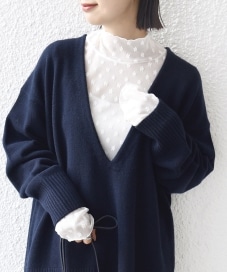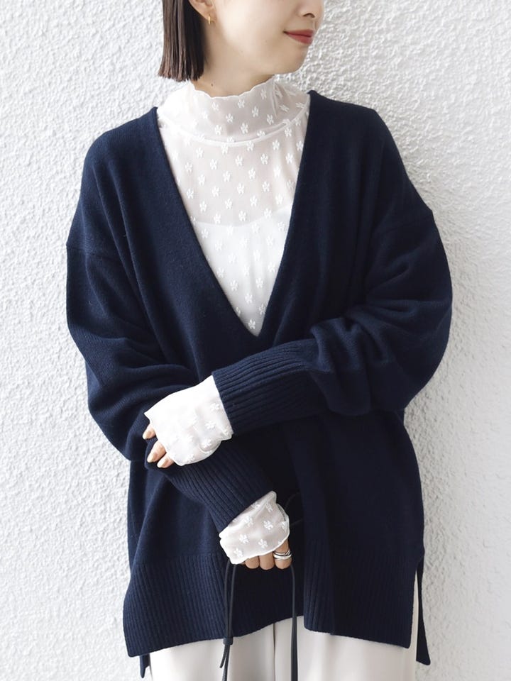 着心地:あたたかく、柔らかな肌触りで快適な着心地。深めのVネックが顔周りをすっきりと見せてくれます。インナーとのレイヤードが映えるのも◎