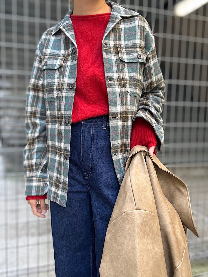 【素材感・着心地】淡いグリーンベースのチェック柄オーバーシャツ。