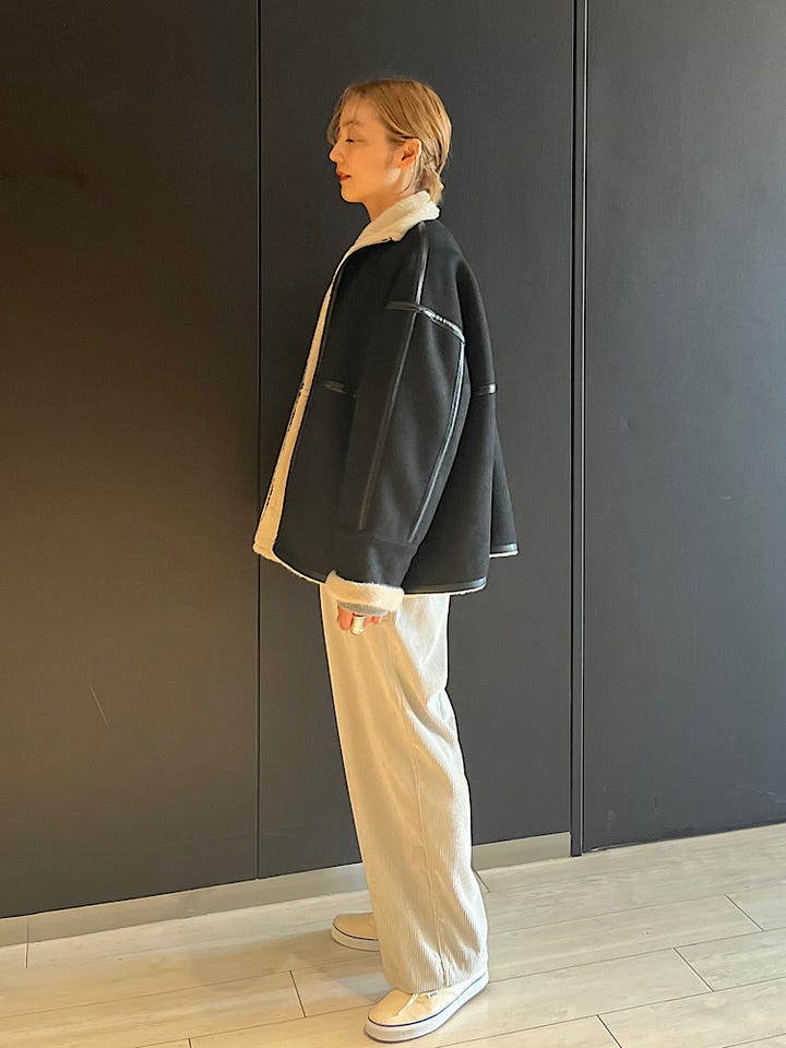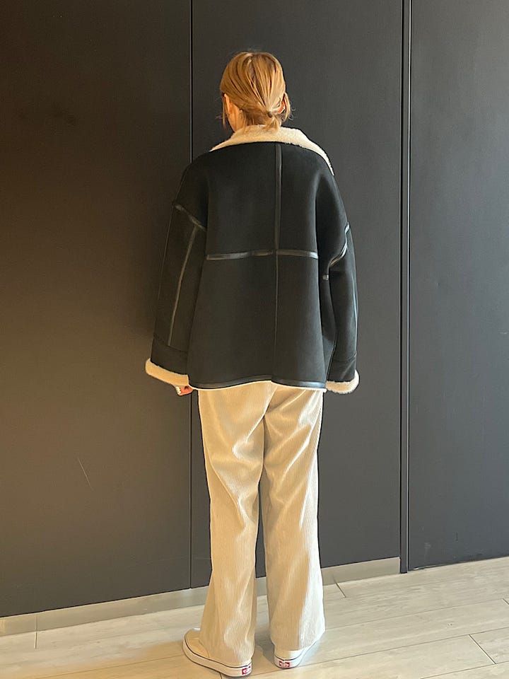 【素材感・着心地】ポリエステル素材のフェイクムートン生地です。肩周り、身幅はゆったりとしておりインナーを選ばず着用できます。袖は長めなので折り返しても可愛いです