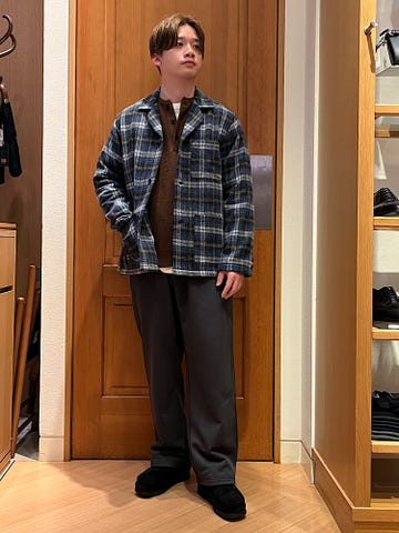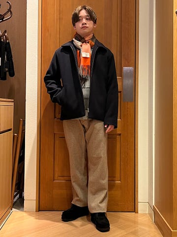 【素材感・着心地】ウールシルクのテーパードチノパン。程良くスマートなテーパードシルエットで、シンプルで大人っぽい印象。季節感もあり冬に活躍。