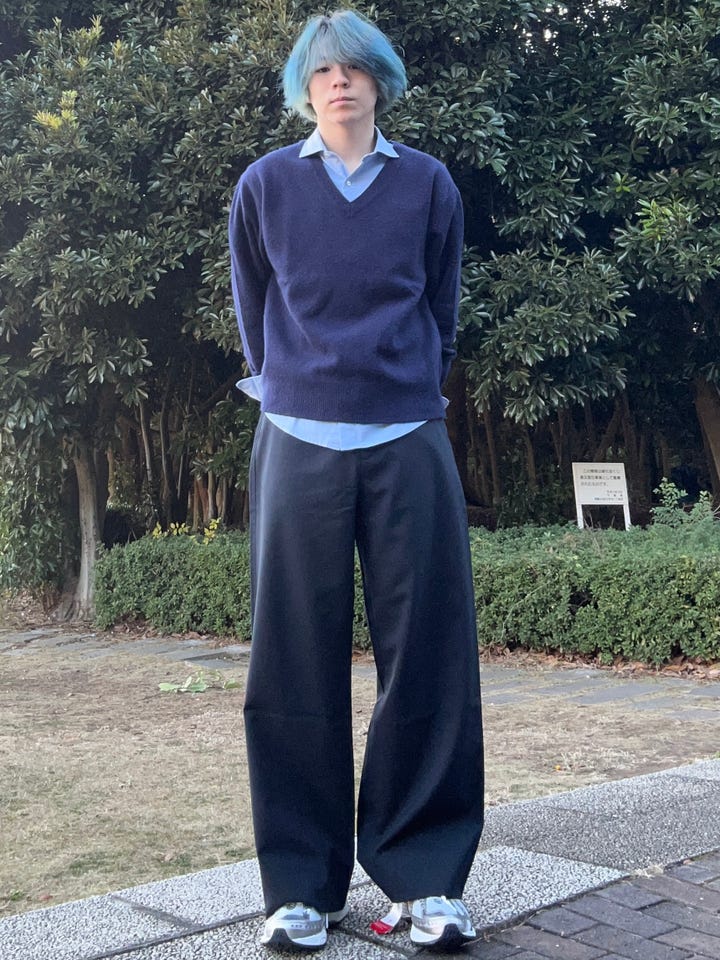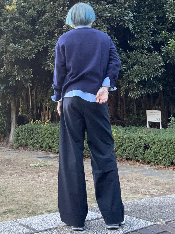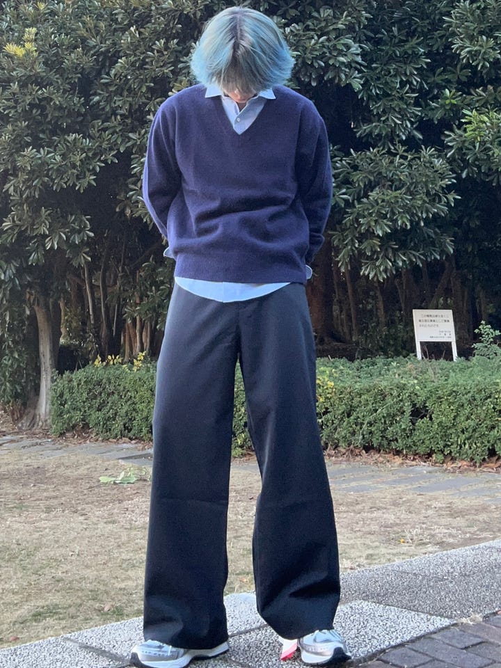 素材感/着心地:股上を浅くしてややフレアにし脚長見えするシルエットになっています、だいぶゆったりと大きいので三角形を意識できるスタイルにできます。