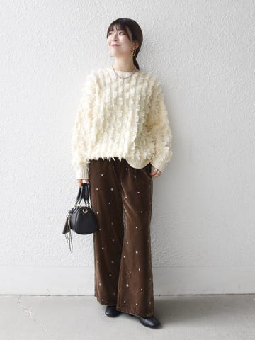 花柄ベロアのワンピにパンツを重ねて、甘さを抑えたレイヤードスタイルに.