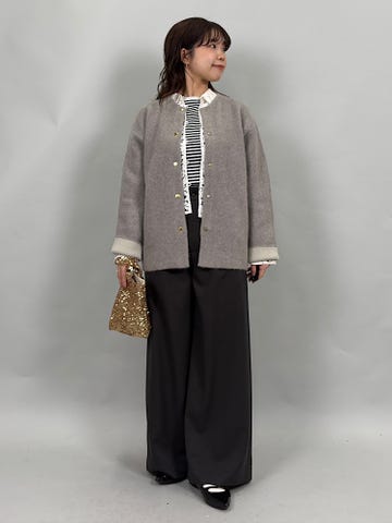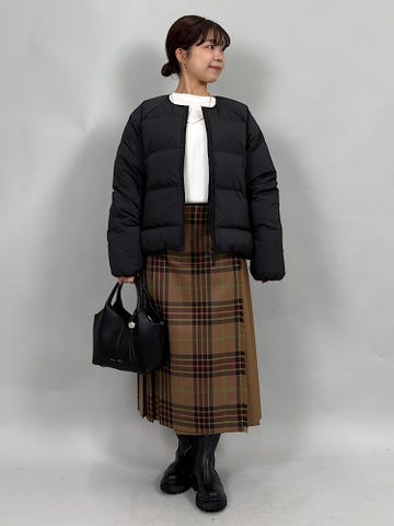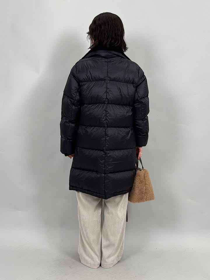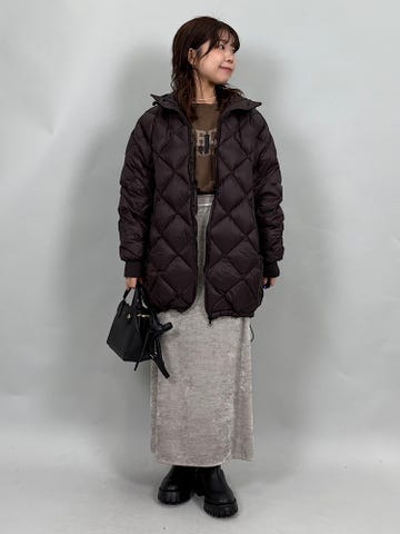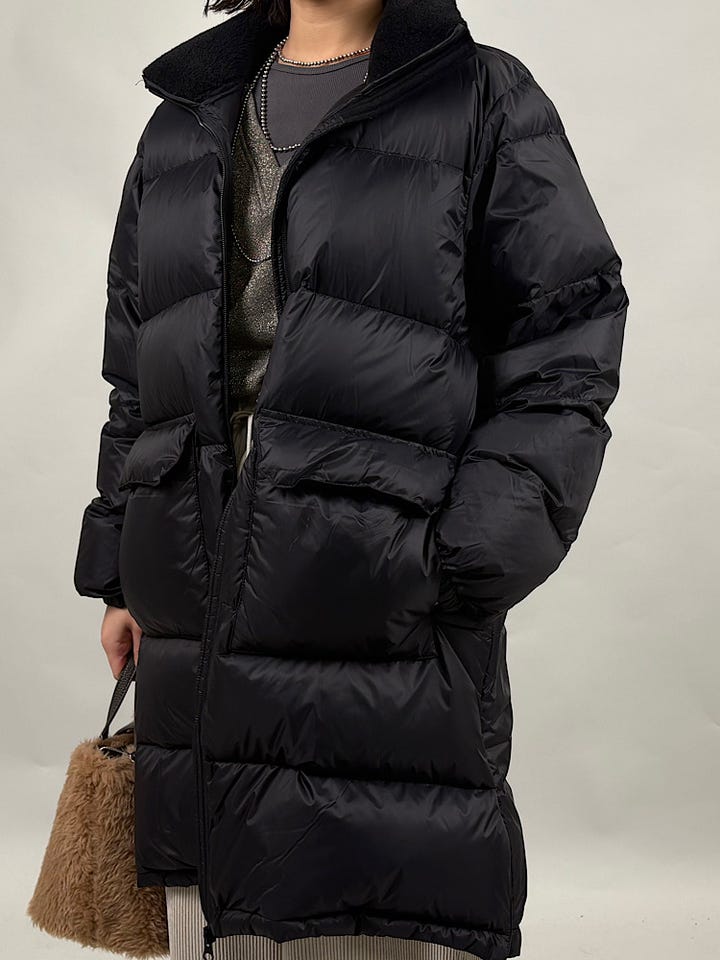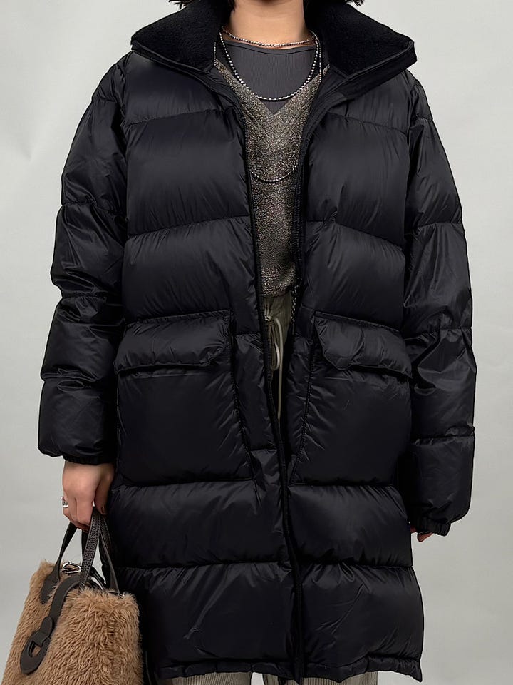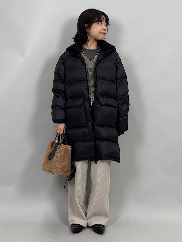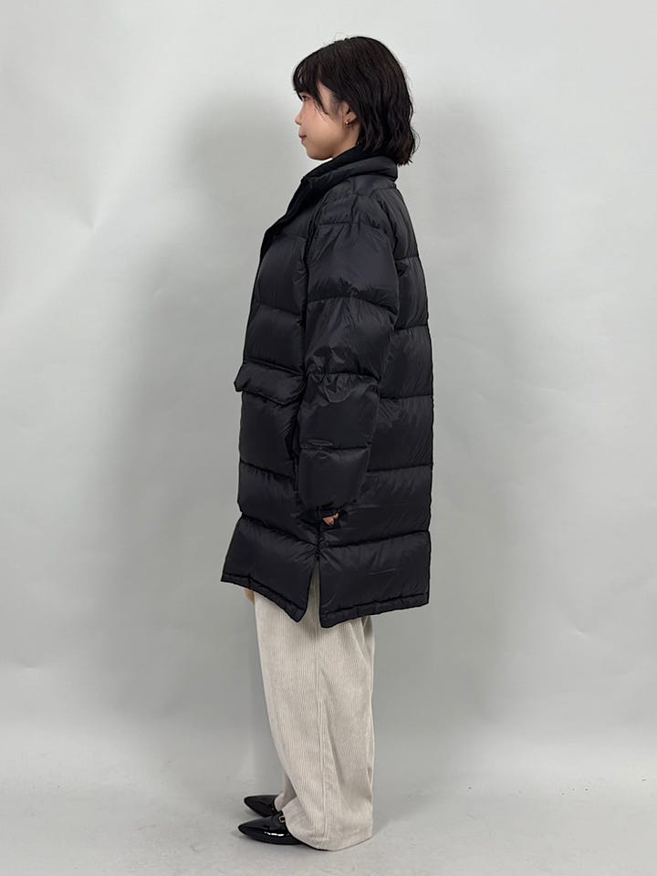 ダウン、フェザー素材。ダウン95%でFP800と、上質なダウンです◎非常に軽くあたたかいので、真冬にも重宝します。別注のネック部分のボアがあたたかくかわいいです。ジップを開けるとサイドスリットができ、雰囲気を変えていただけます。