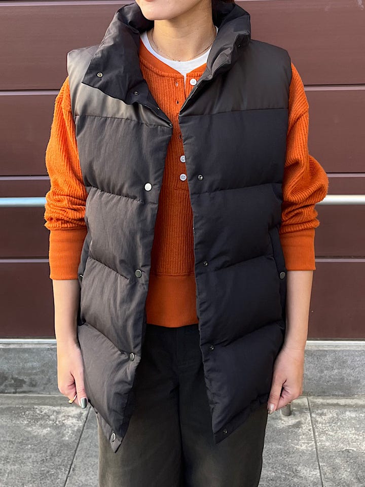 素材感・着心地: メンズライクで大人カジュアルに着こなしていただけるダウンベスト。
