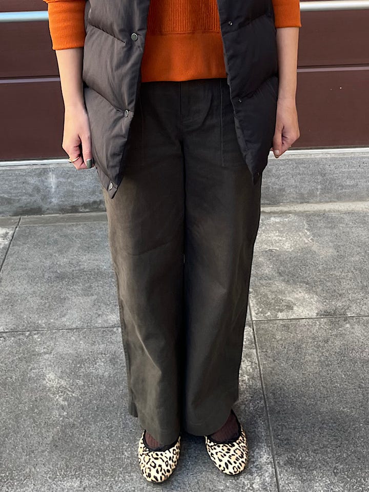 素材感・着心地: ワイドストレートシルエットのベイカーパンツ。