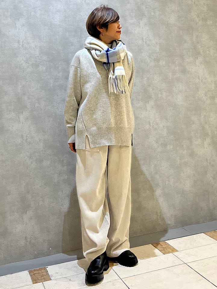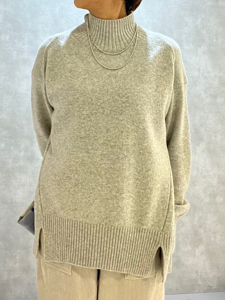 着用感 : カシミアが少し入っているので着た瞬間に暖かく感じます。ハイネックですがあまり首の詰まりは感じないです。