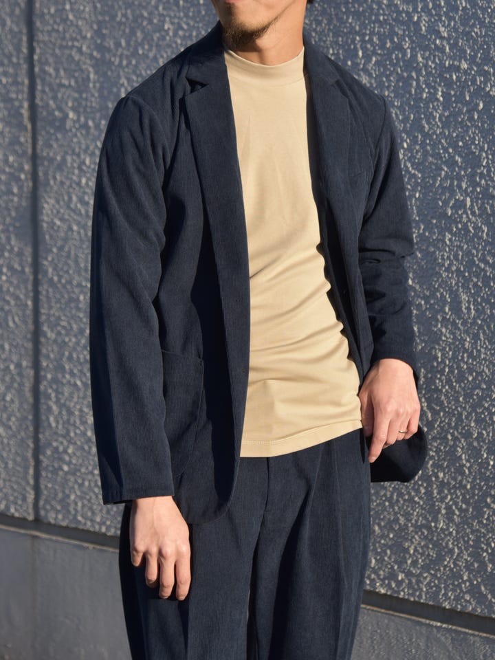 柔らかなコーデュロイセットアップを使用したビジカジスタイル。