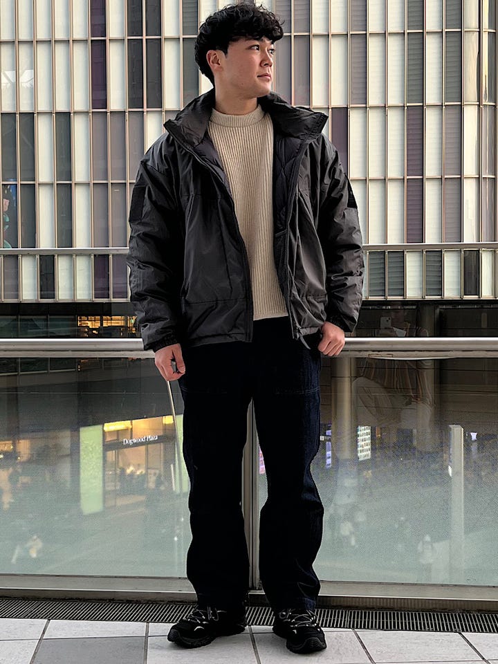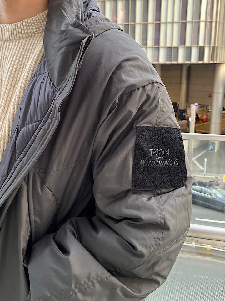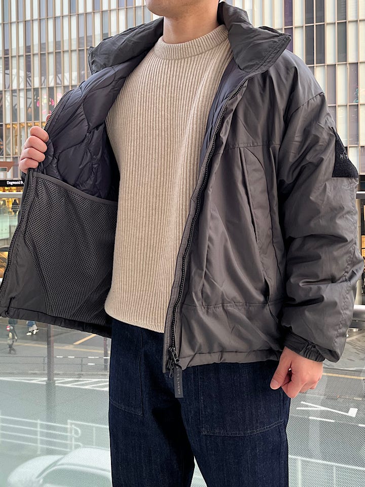 着心地:非常に軽くシルエットもゆとりがあるので着込んでいただいても着膨れしずらい一着になっておりTAIONさんの中綿が使用されており非常に保温性も優れている一着になってます。