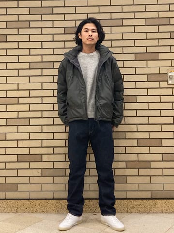 スポーティな素材感のカーコートを少し上品にスタイリング