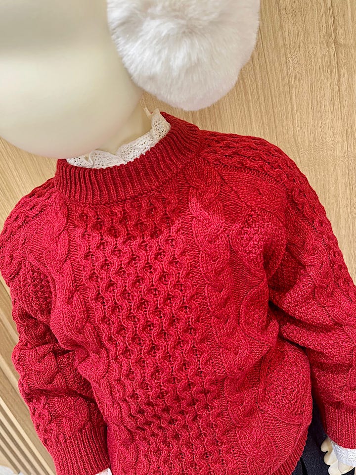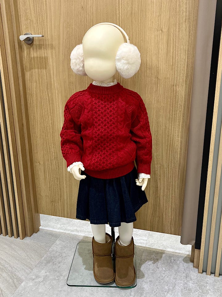 ケーブル編みの赤いセーターがアクセントになっていてクリスマスにおすすめのコーデです♪