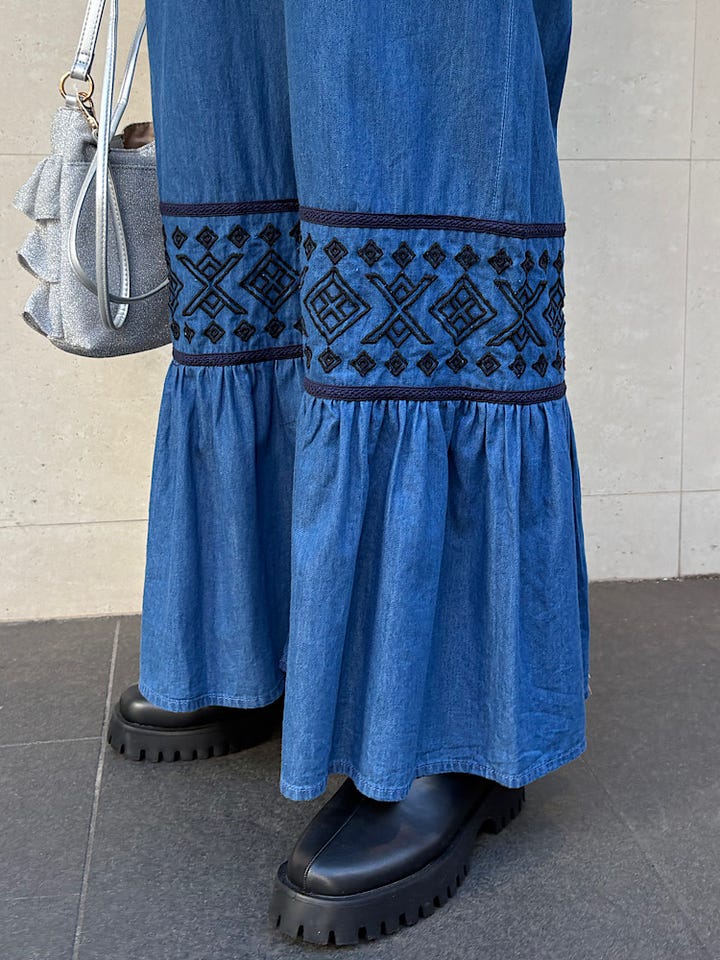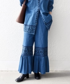 〔ONE SIZE〕bon_meur:〈洗濯機可能〉エンブロイダリー ギャザー フレア デニム イージー パンツ