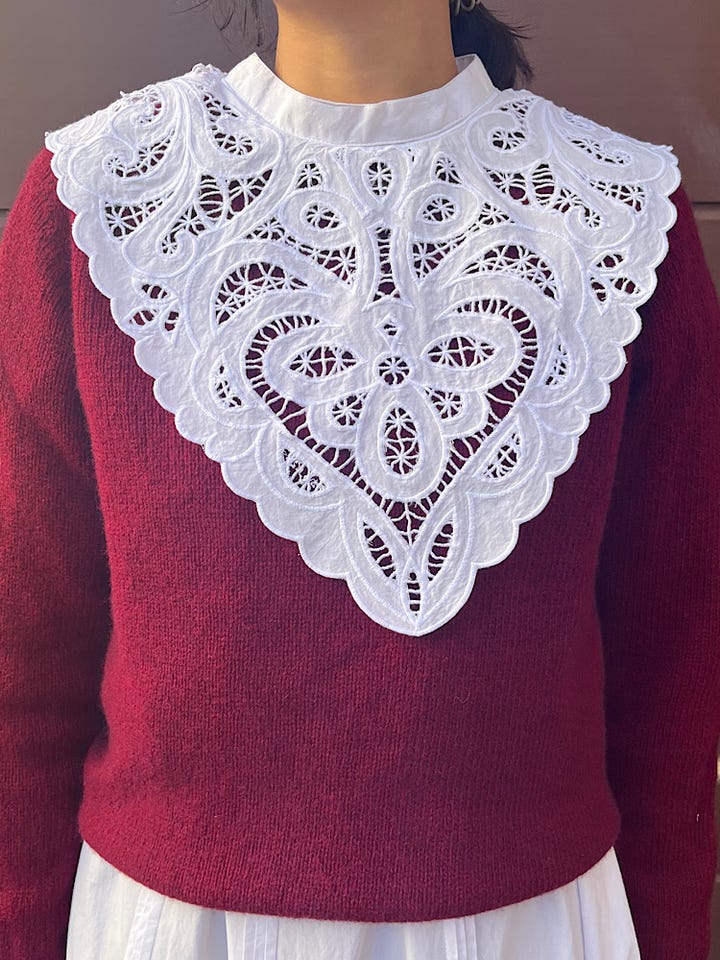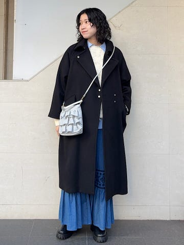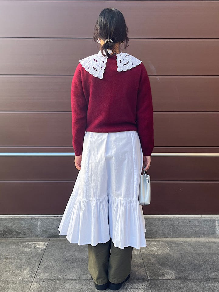 素材感・着心地:全体的にゆったりとしたサイズ感。ニットと合わせ襟元のレースを出し着用すると可愛らしいスタイリングになります。