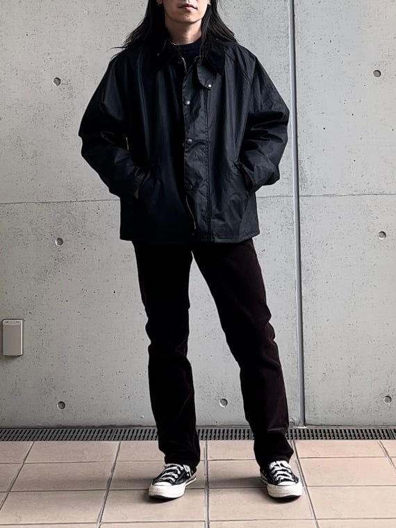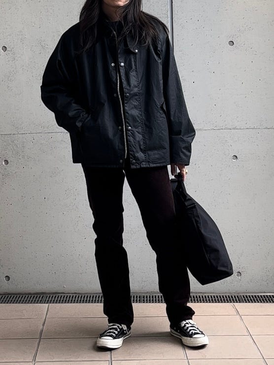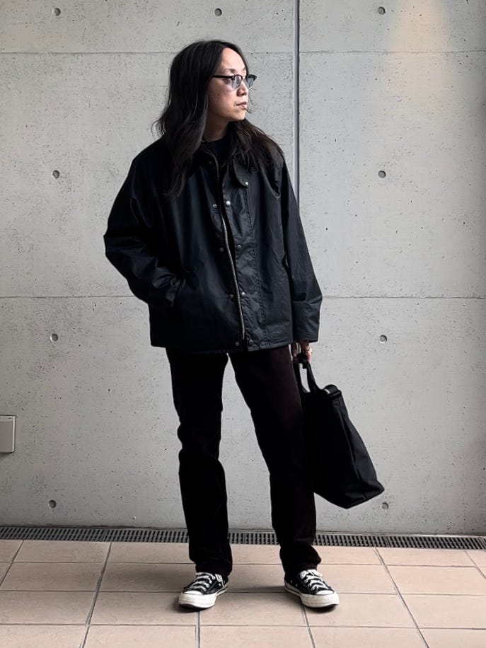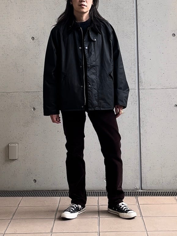 お出掛けやお買い物に最適なコーディネート提案です。ジャケットはバブアーのトランスポートジャケット。程良い丈感なので重ね着し易く、オススメはパーカーなどフードが付いているアイテムで合わせるのもオススメです。参考にしてみてください。