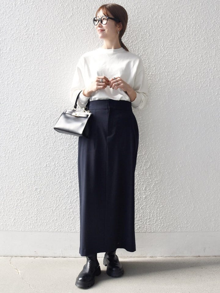 着用アイテム:ウォーム ストレッチ Iライン ベイカー スカート ネイビー