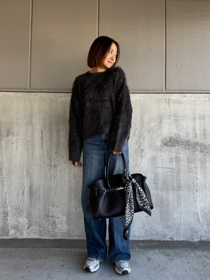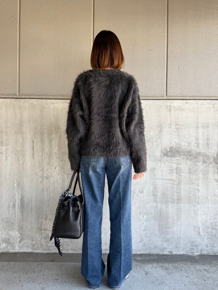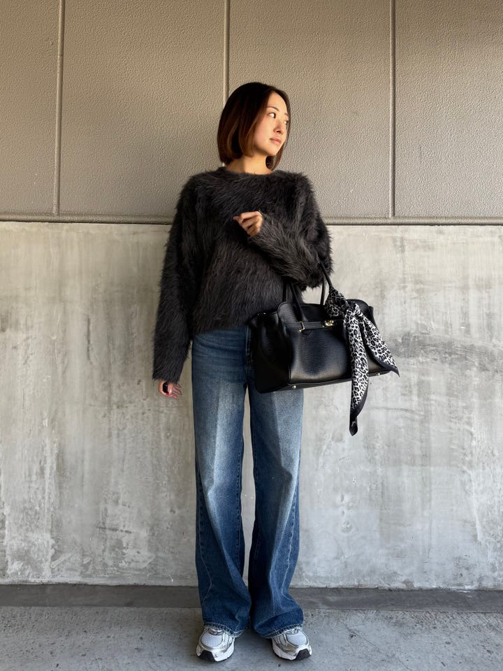 サイズ感・着心地:ゆとりあり。ピチピチ感はないのでタイトはトップスが苦手な方も着ていただけます。丈感もちょうどよく、インせず使えそうです。毛足の長いシャギーが1枚で主役を飾ってくれます。デート服にもぴったり!