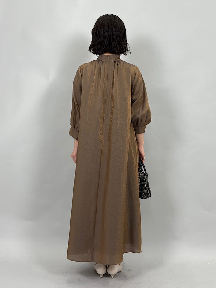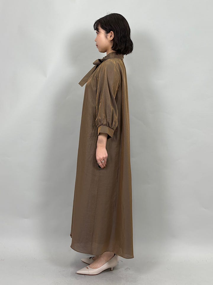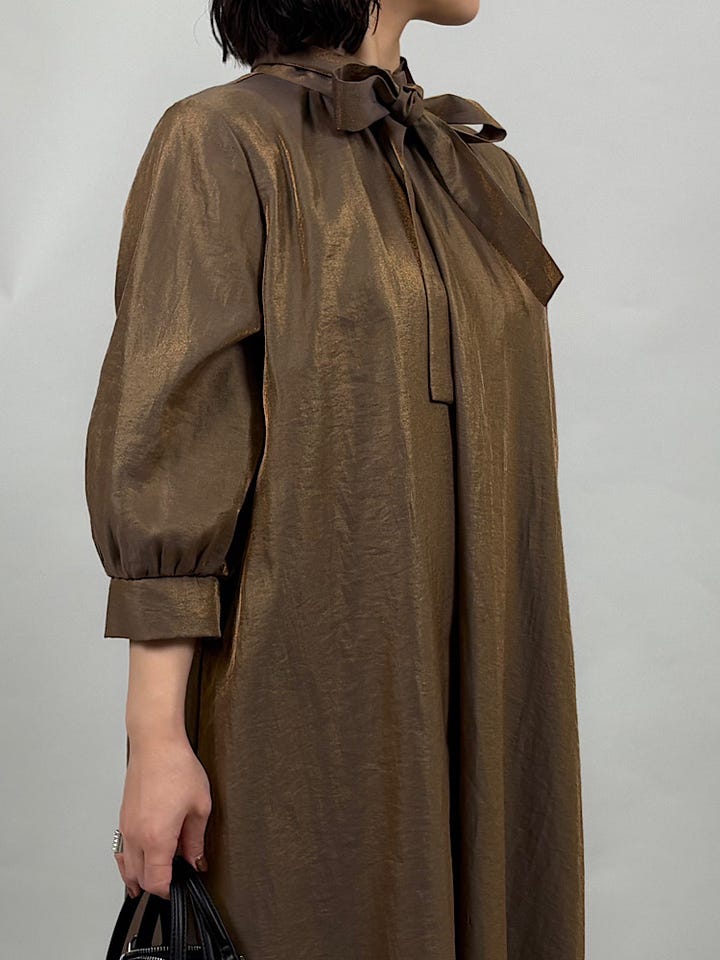 光沢感のあるシャンブレー素材。さらりとした軽い着心地です。Aラインで腕まわりにもゆとりがありとても楽に着ていただけます。ボウタイの結び方によって3通り、ちがった雰囲気で楽しんでいただけます◎