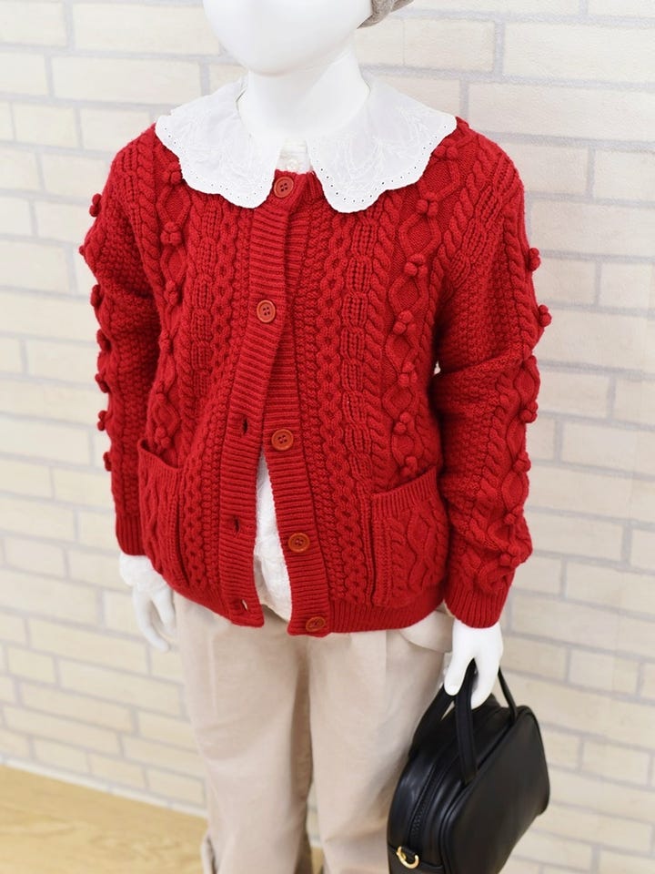 ポンポンデザインが可愛らしいケーブルカーディガン。