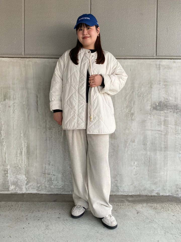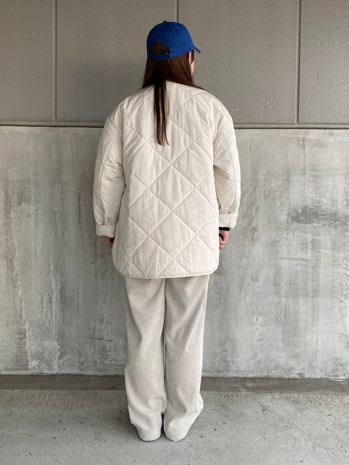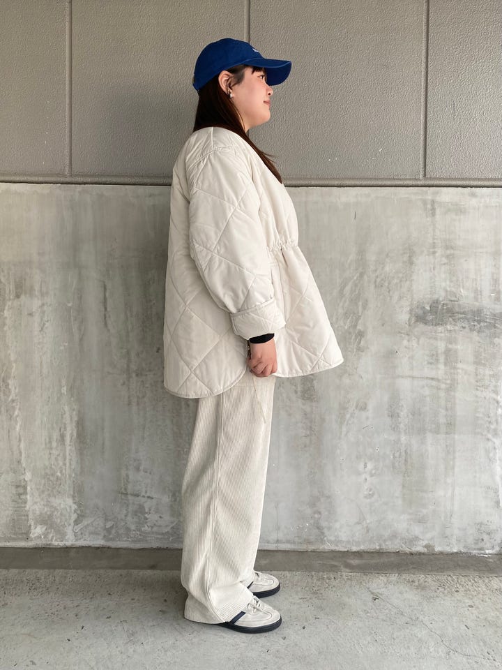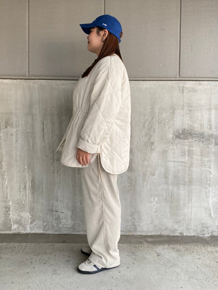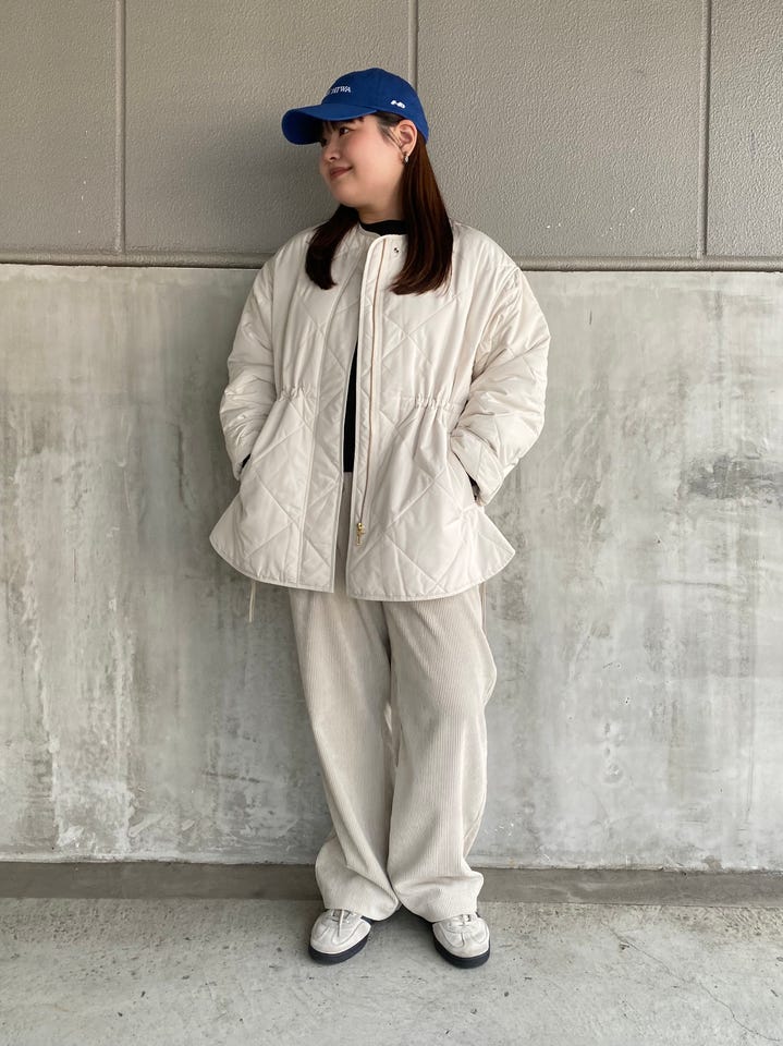 着心地:軽くてサッと羽織りやすいキルティングブルゾン!ゆったりサイズなので、厚手のトップスや重ね着でも窮屈感なく着ていただけます。ウエスト裏側はすぼめられるようになっているので、キュッと絞って着るのもオススメです。