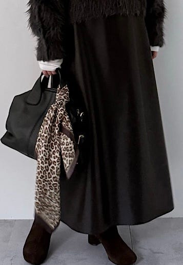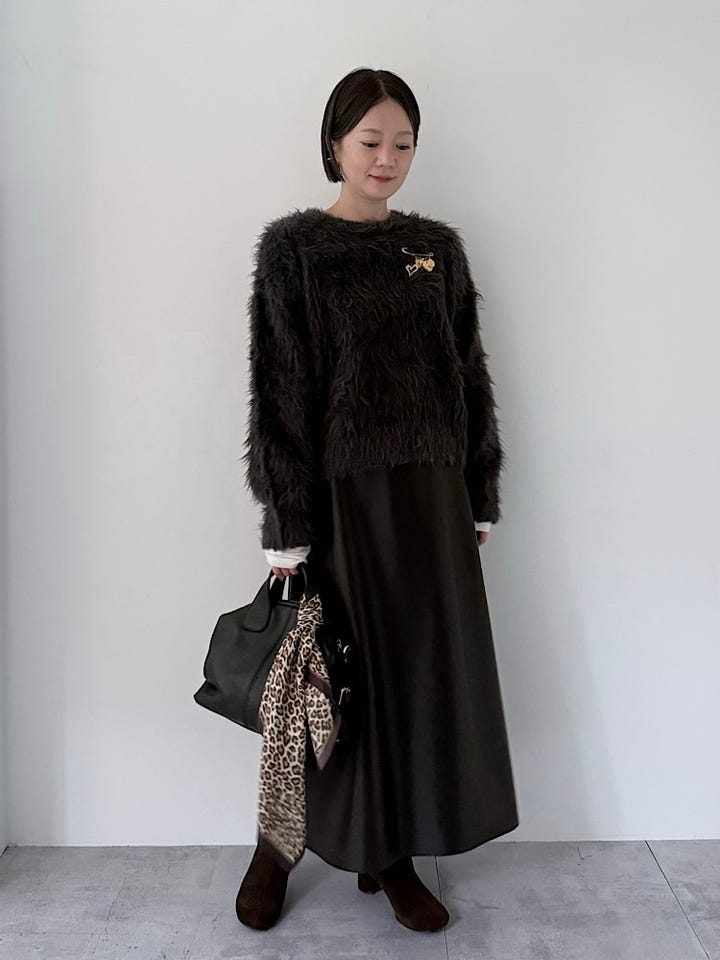 着心地:レザー調の存在感ある生地です。スカートのラインがはっきりでるので、ふわふわニットと相性?です。
