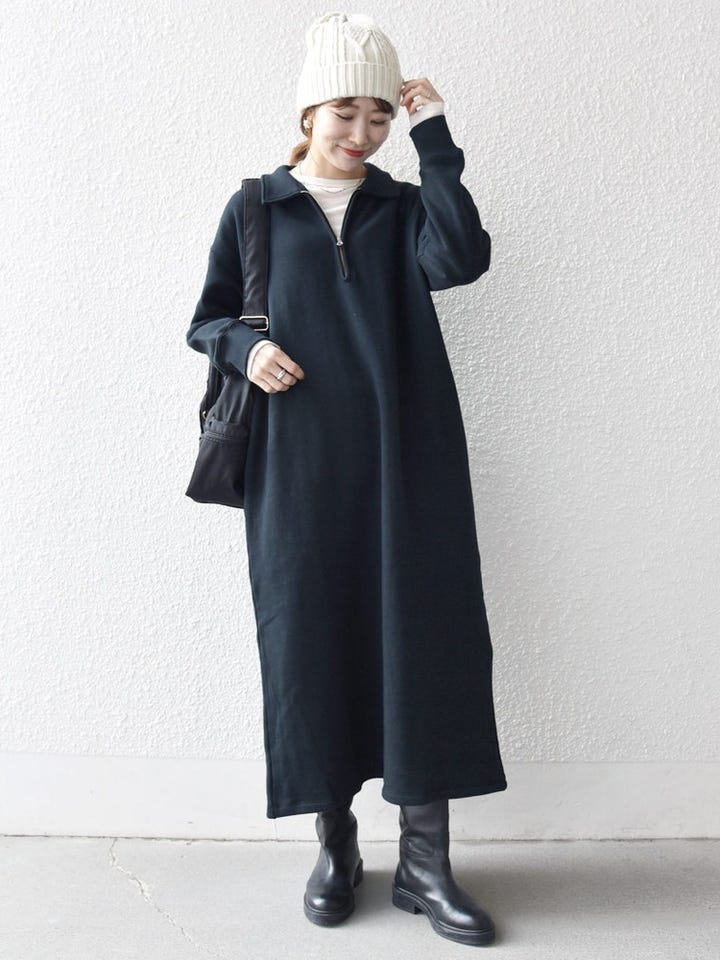 着用アイテム:USA コットン 裏起毛 ハーフジップ ワンピース ブラック