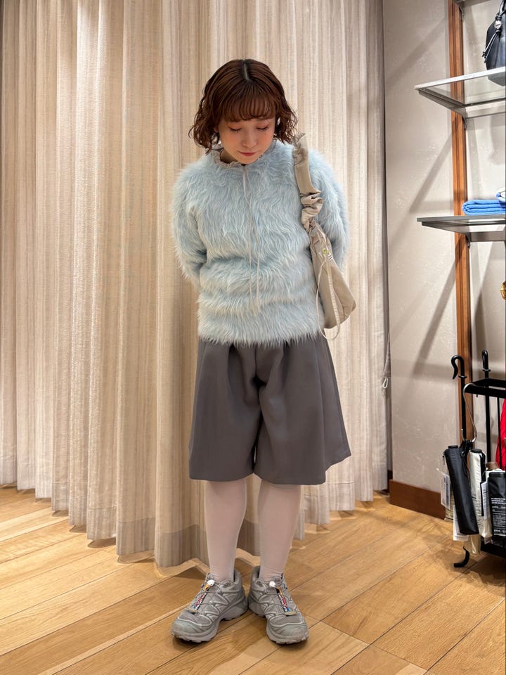 着心地:毛足長めのシャギーニットですが短丈なので小柄な方でもバランス良く着用していただけます。淡いカラーがとても可愛い1枚。シャツやカットソーとレイヤードしても◎