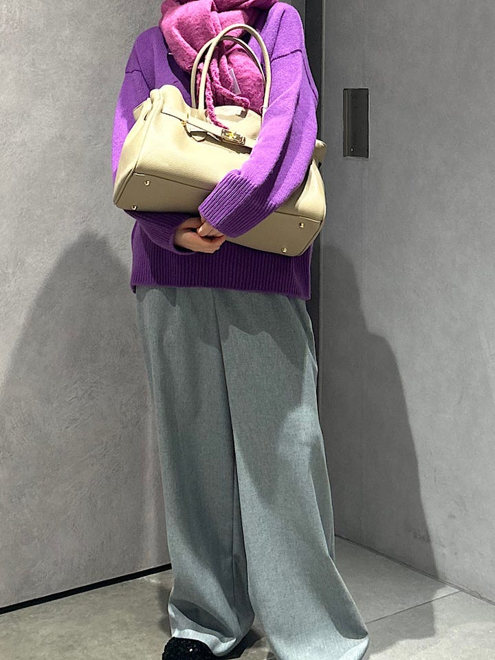 素材感・着心地:厚手のニット素材ですが軽くて動きやすいです。ゆとりありなフィット感でカットソーやシャツレイヤードもおすすめです。やわらかな発色がかわいいです。