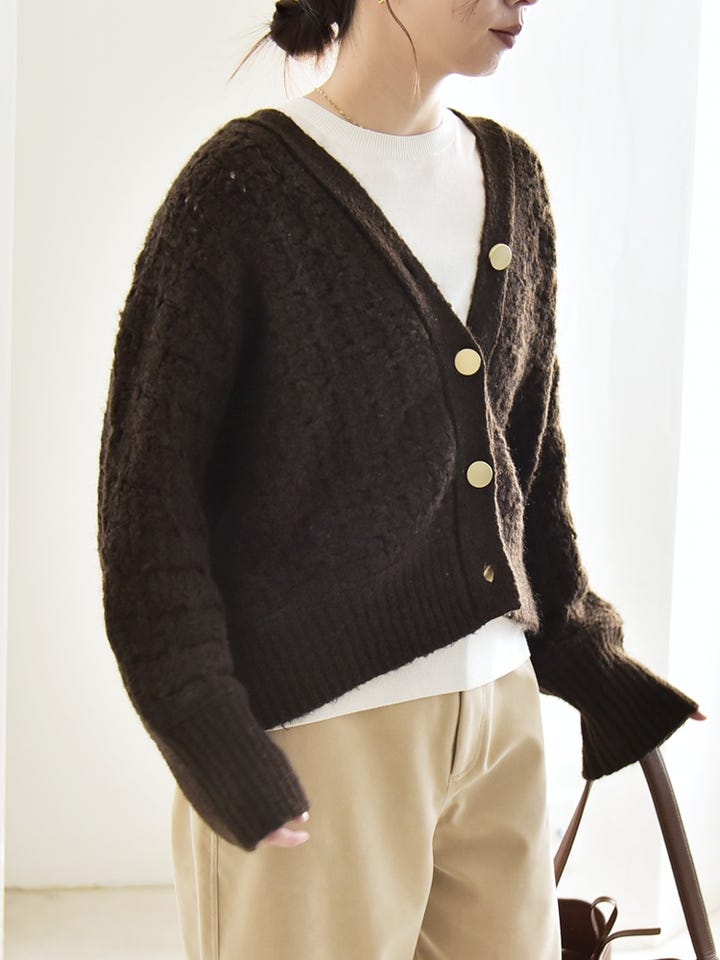 〔ONE SIZE〕quaranciel: 透かし編み Vネック コンパクト ドルマンニットカーディガン