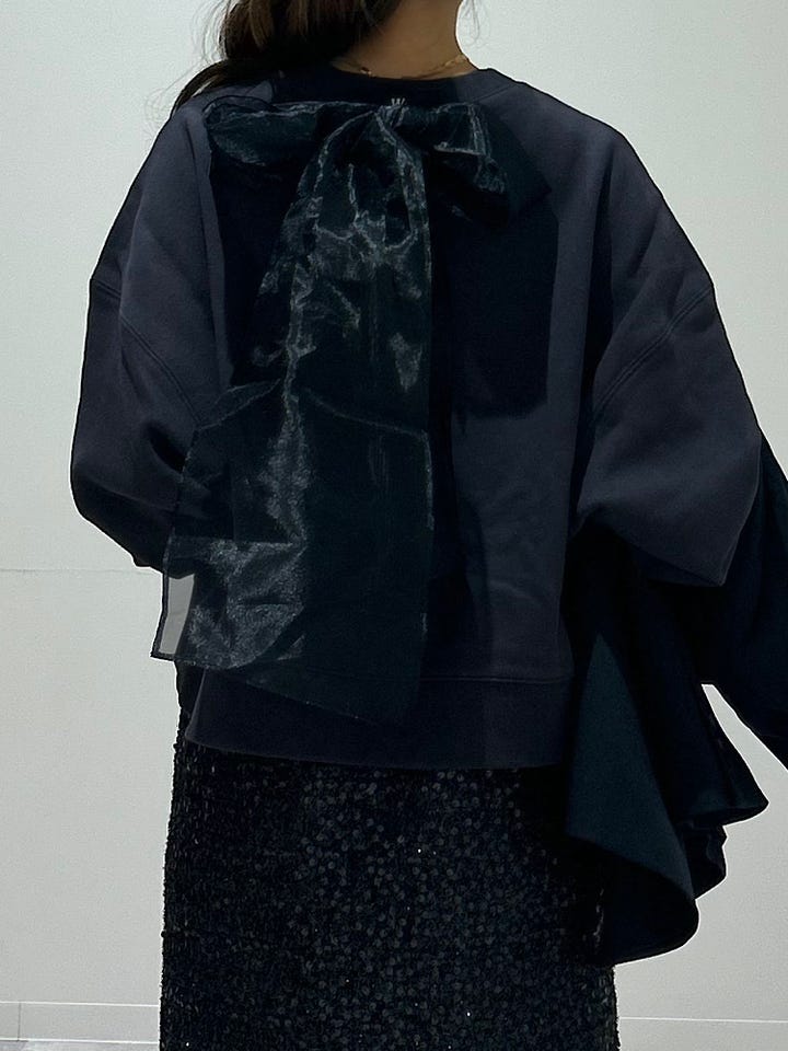 【素材感・着心地】若干丈が短めでバックのオーガンジーのリボンは取り外しが可能で首に巻いたりと様々な着こなしが楽しめます。