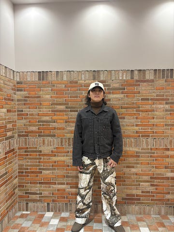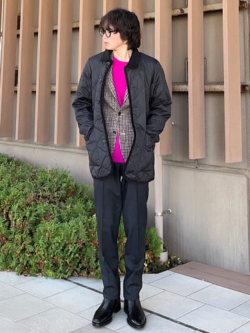 上下ブラックデニムでセットアップ感を出しインナーはネイビーで静かにまとめます!