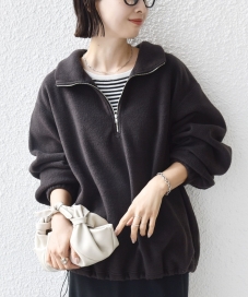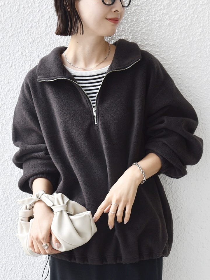 〔ONE SIZE〕〈洗濯機可能〉フリース 裾 ドロスト ハーフ ジップ プルオーバー