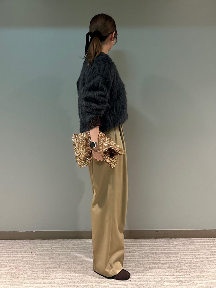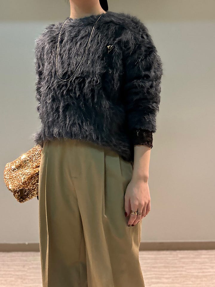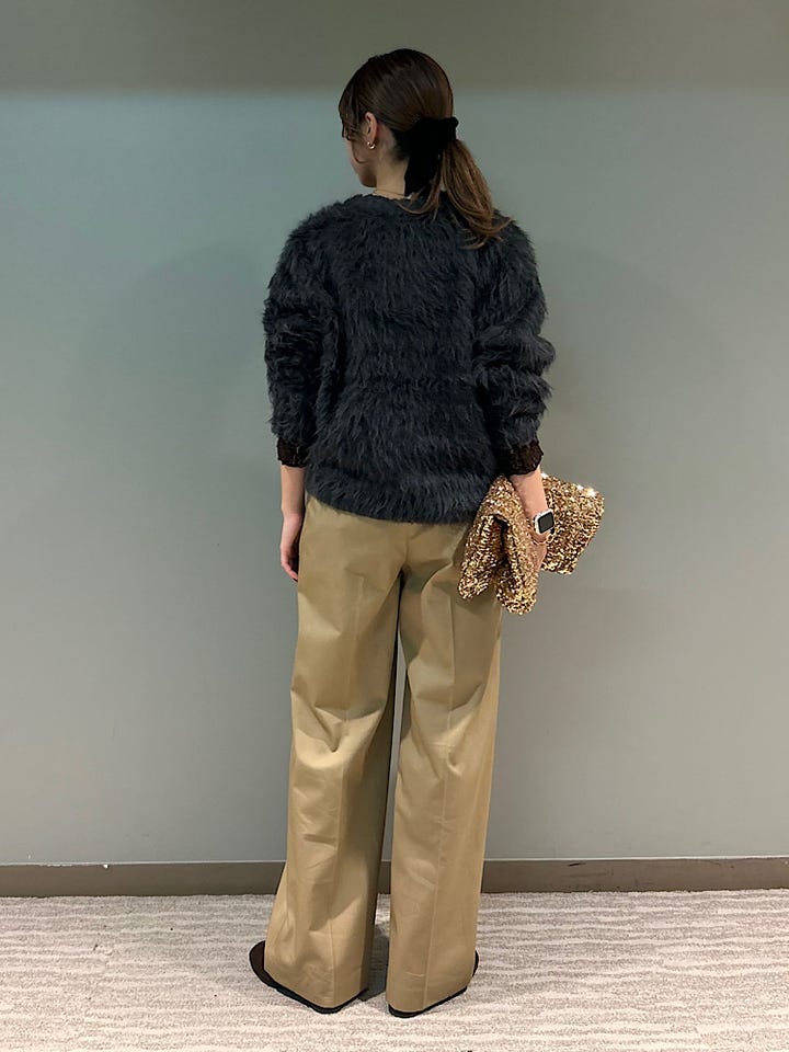 シャギーニットは着膨れしそうなイメージですが首周りに少しゆとりがあるのでバランスよく綺麗に着用いただけます。