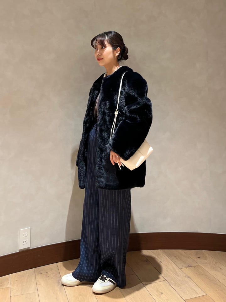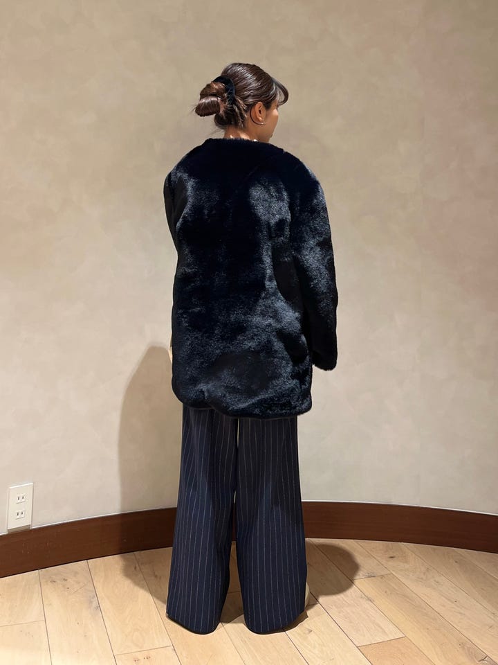 〔ONE SIZE〕SHIPS Primary Navy Label:フェイク ファー ノーカラー ハーフ コート