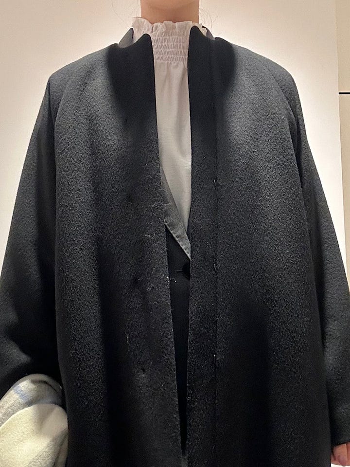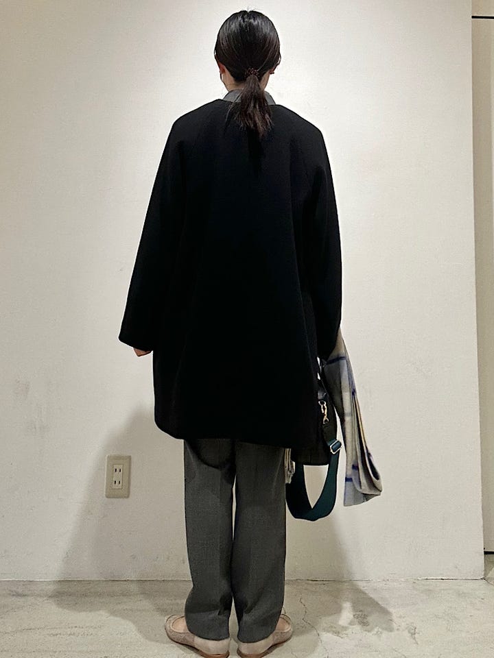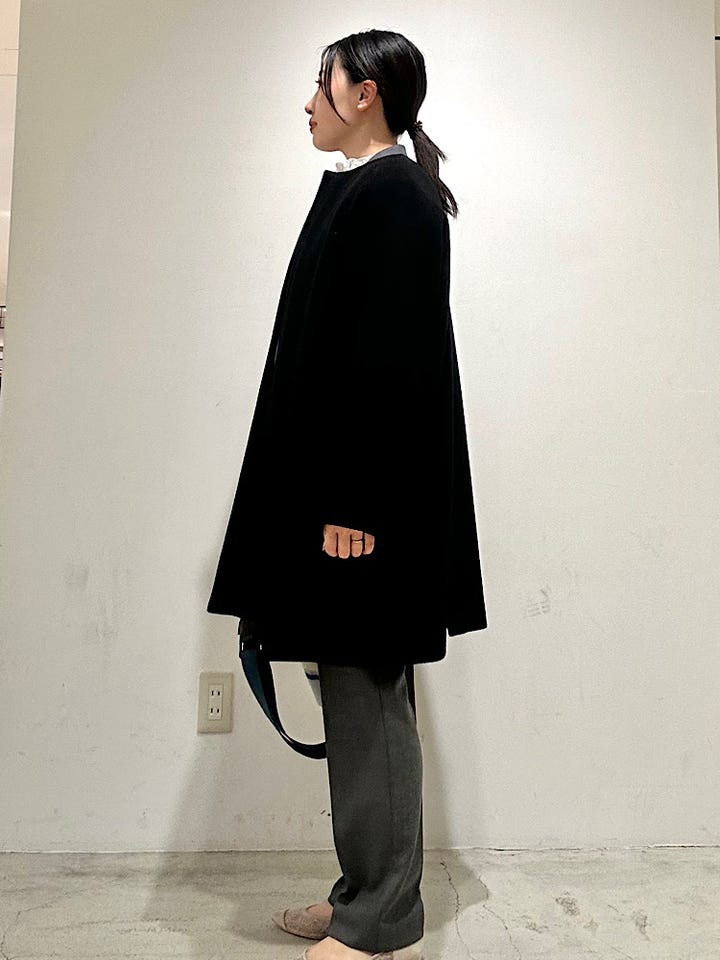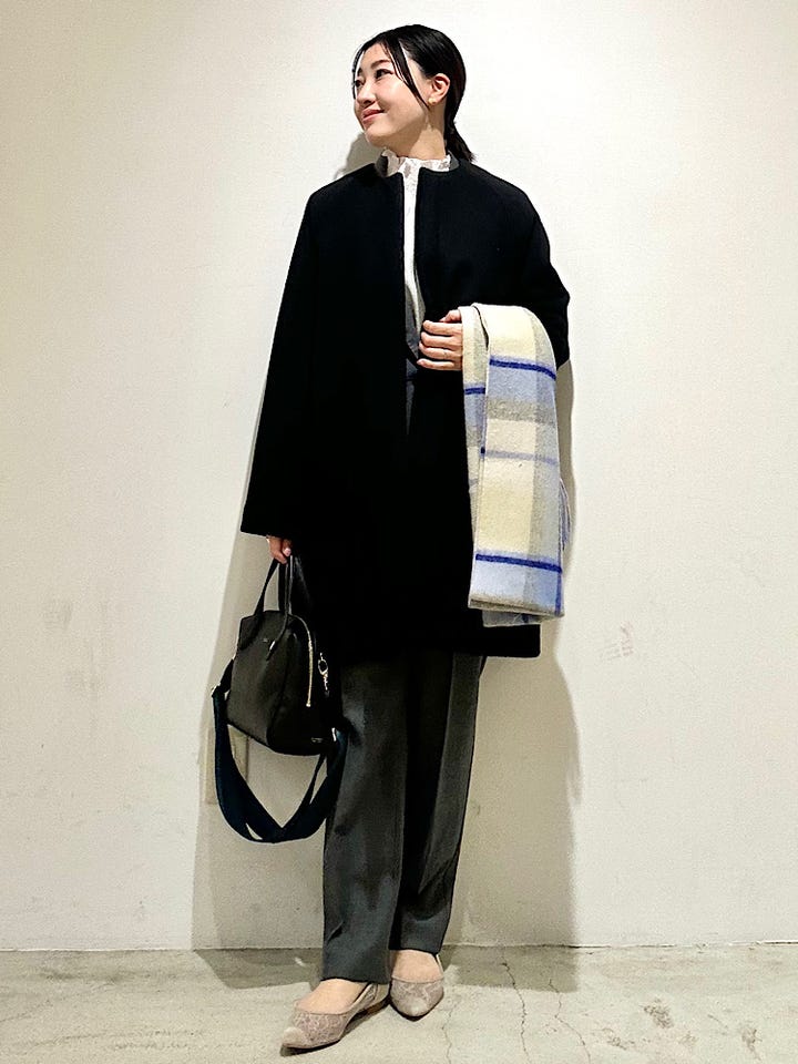 アウターはフォーマルにも使える黒のノーカラーコートなら長年愛用しやすくおすすめ。
