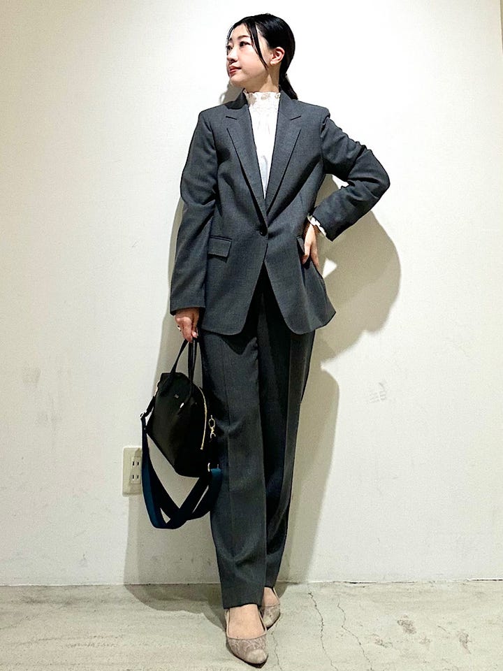 マンネリしやすいスーツスタイル、冬はハイネックのブラウスでアップデート◎