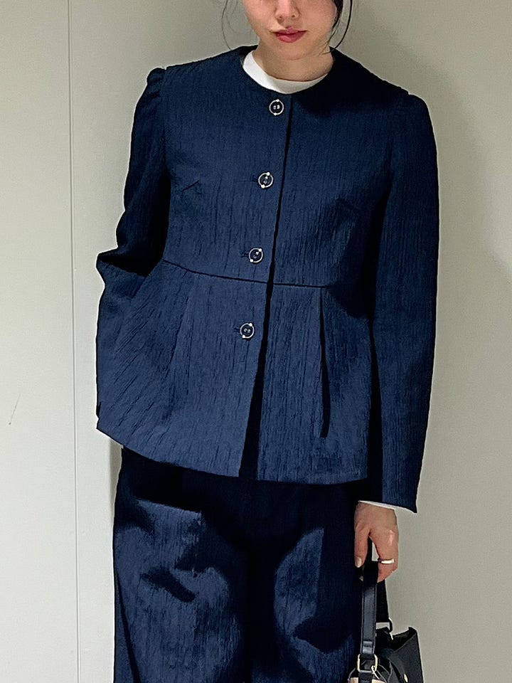 〔ONE SIZE〕SHIPS any:〈手洗い可能〉ジャカード ノーカラー ペプラム ジャケット[NAVY BLUE]