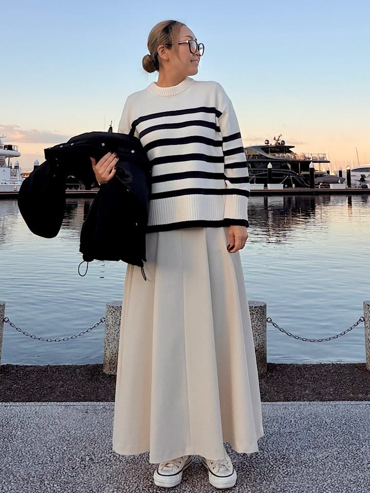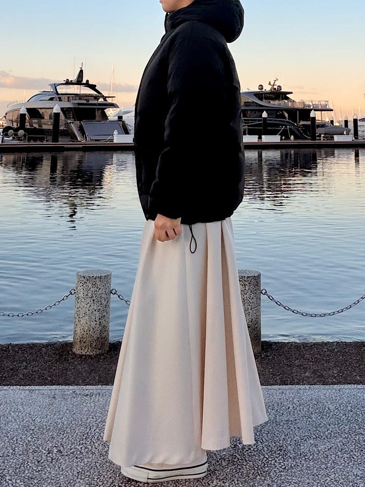 【素材感・着心地】柔らかくしなやかな風合いが特徴のカルゼ素材使用。前後にインタックが入っていてすっきりとしたシルエットです!ウエスト後ろはゴムになっておりストレスフリーな履き心地も魅力的なスカートです♪
