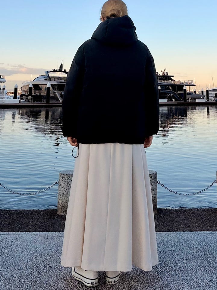 【素材感・着心地】リサイクルダウン使用。ボリュームのあるシルエットで真冬にも暖かく着用していただけます!長すぎない着丈なのでワイドパンツやスカートなどとの相性も◎