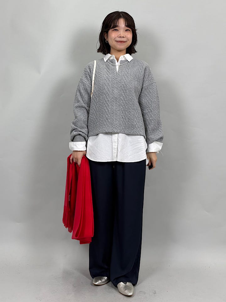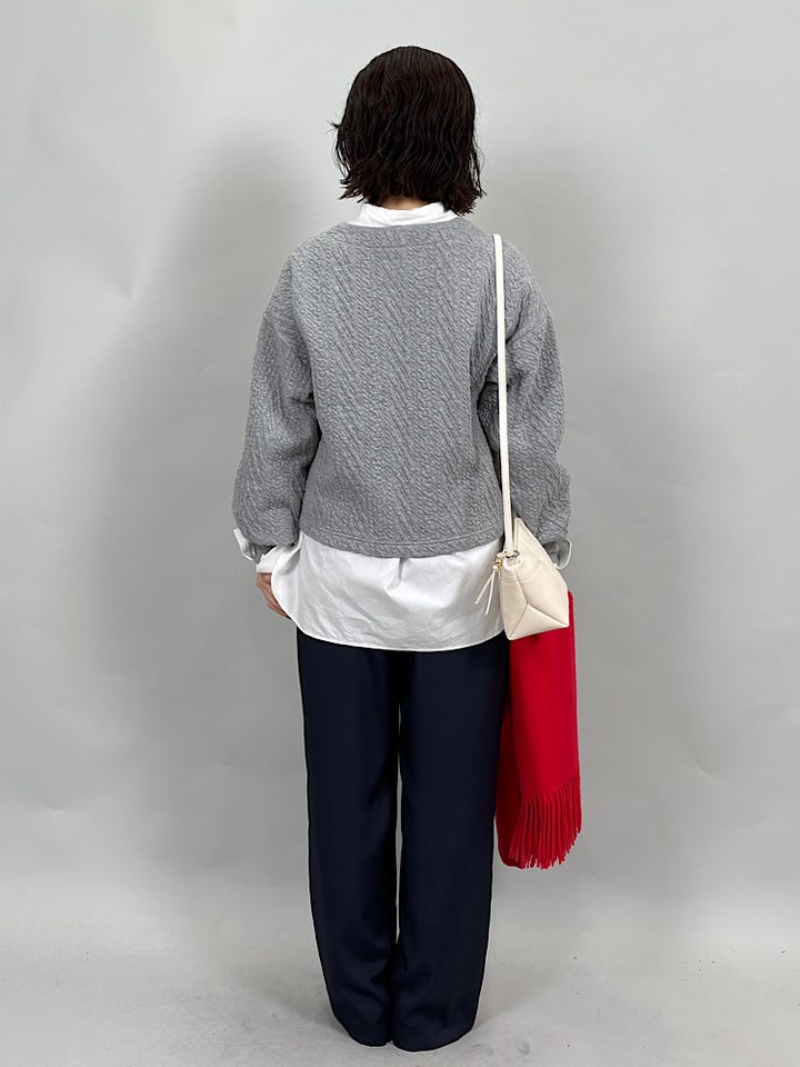 軽く肌触りの良いジャージー素材。伸縮性があり着心地がいいです◎リラックス感のある素材ですが、ケーブル模様が入っており短丈なので、綺麗めにも着ていただけます!