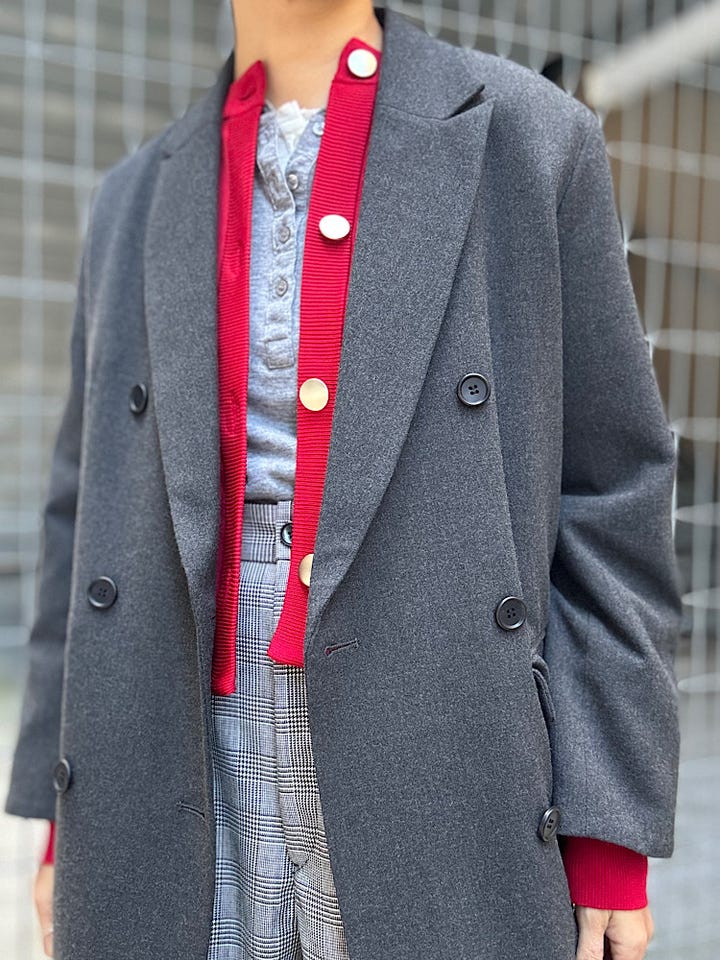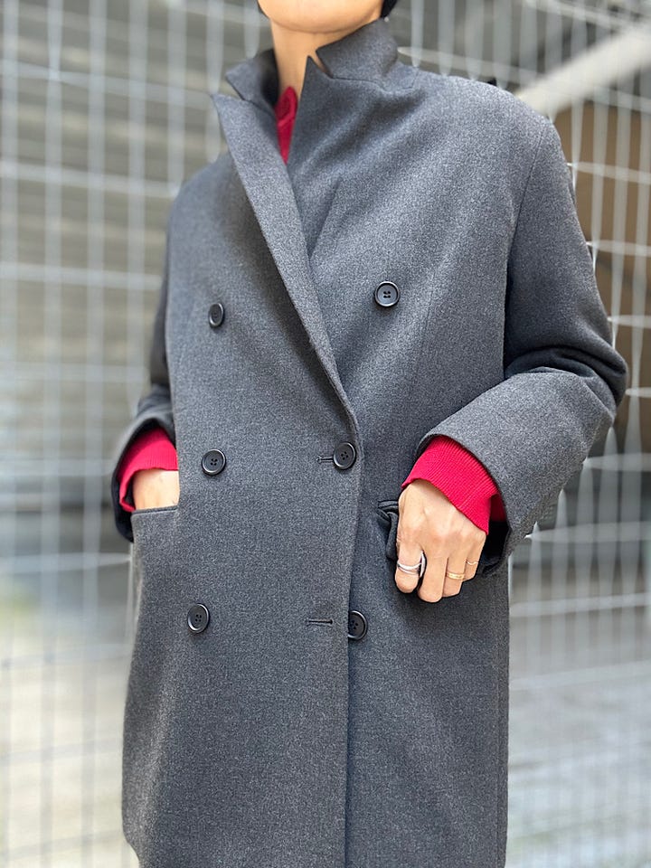 【素材感・着心地】オーバーサイズダブルジャケット。厚手のトップスの上からでも着用しやすいサイズ感でアウターとしても◎