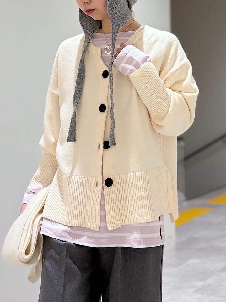 【素材感・着心地】カジュアルにもきれいめもどちらも着て頂けます!!前開きなので着回しも抜群です♪とにかく着心地が気持ちです♪キーネックになっていらので首元がすっきりとした印象!ステッチのような編みのデザインも可愛いポイントです!