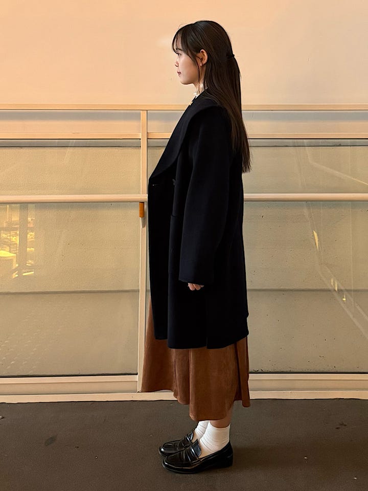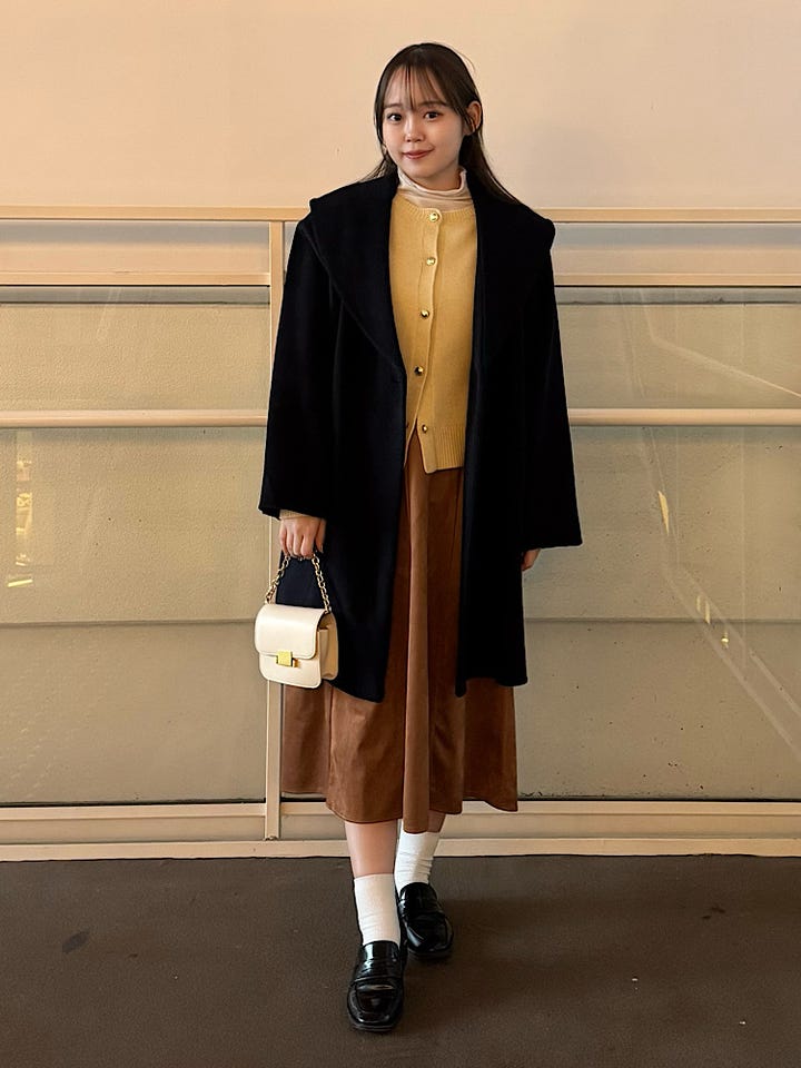 素材感/着心地:生地が厚めなのでフレア感を残しつつ、下に落ちてくれるので広がりすぎずキレイに履いていただけます。長さも長すぎないので程よく足が見えて細見えします!