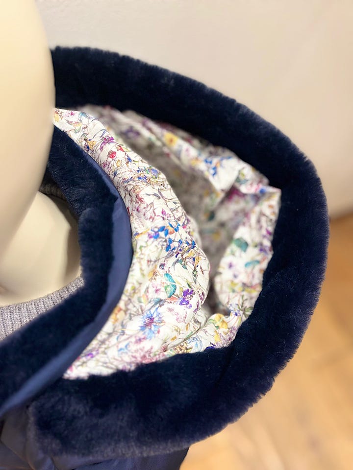 フードからちらっと見えるリバティ柄がポイントのダウンジャケット♪