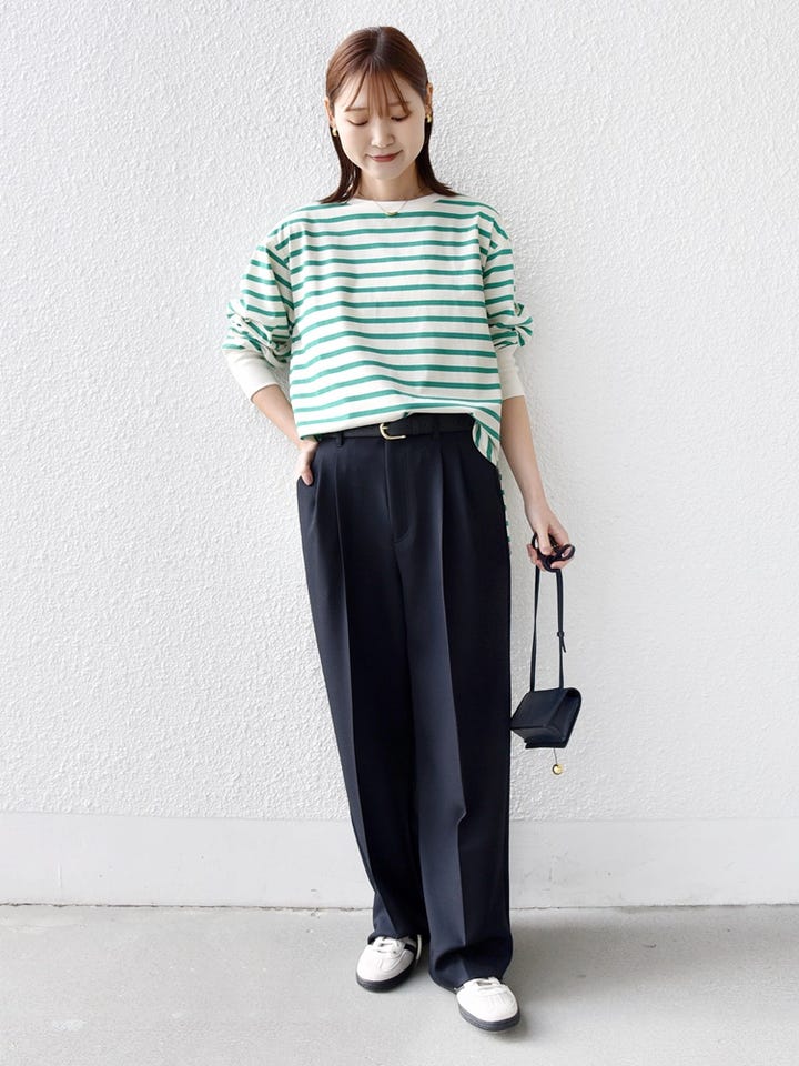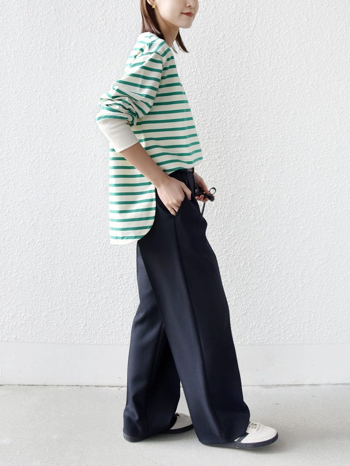 ■着心地:スッキリ見えしますが、着用感はゆったりとしていて楽です。通年穿きやすい1枚です。