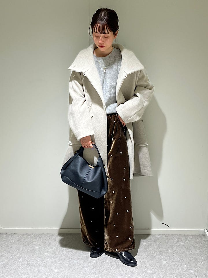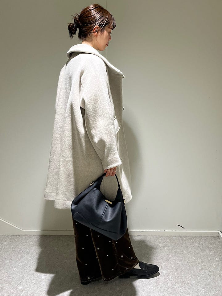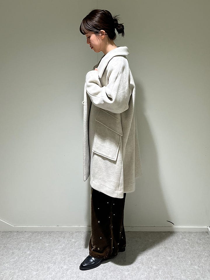 ミドル丈のコートで着丈長すぎず動きやすいです!スタンドカラーなので襟を立てて着用して頂くとマフラー無しでも首周り暖かく過ごせます。着用のナチュラルカラーは万能に合わせやすいカラーなので持っておくと重宝するのでおすすめです。